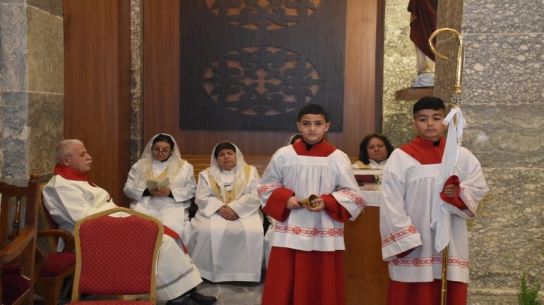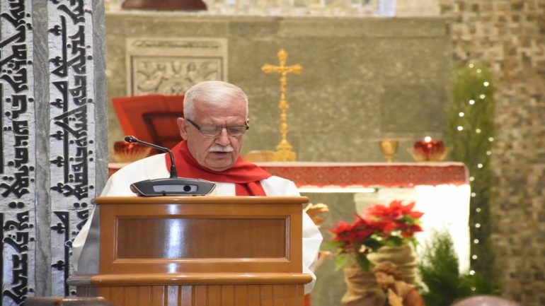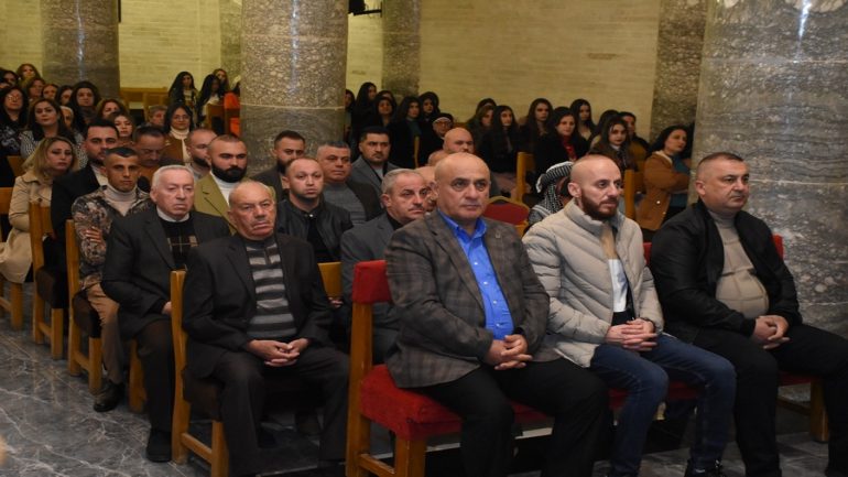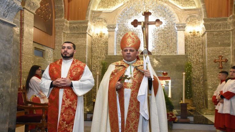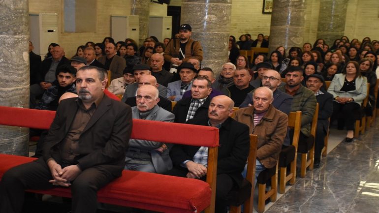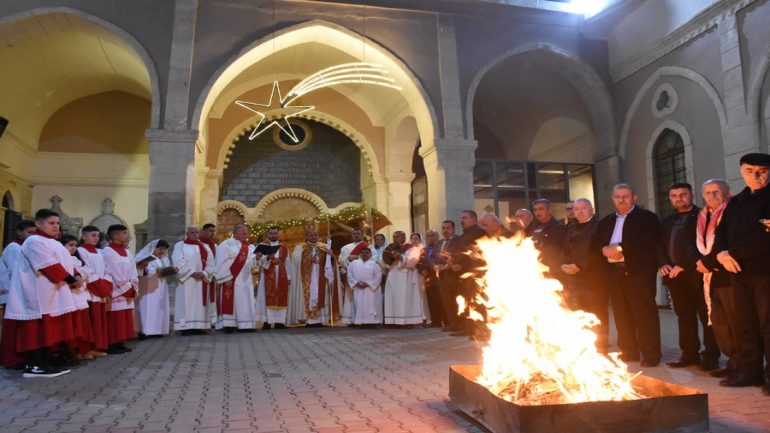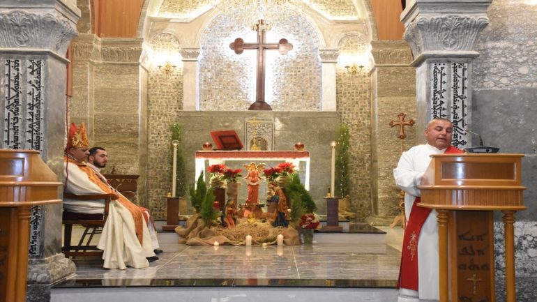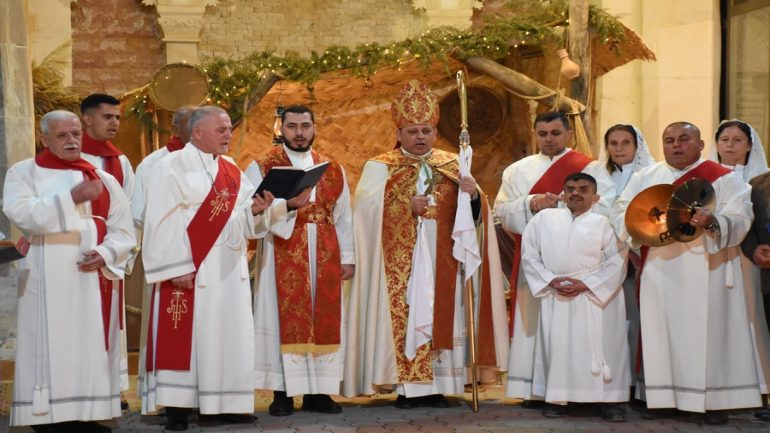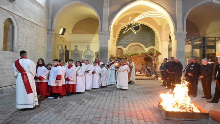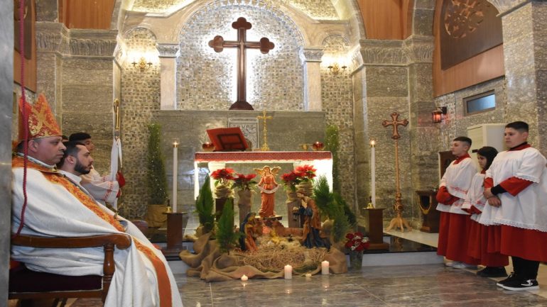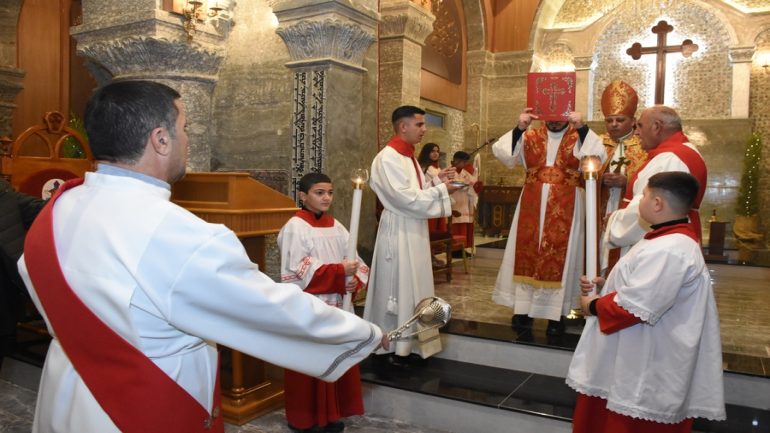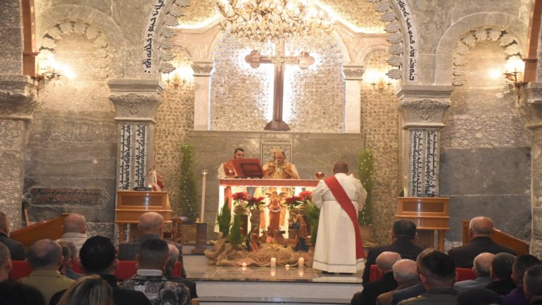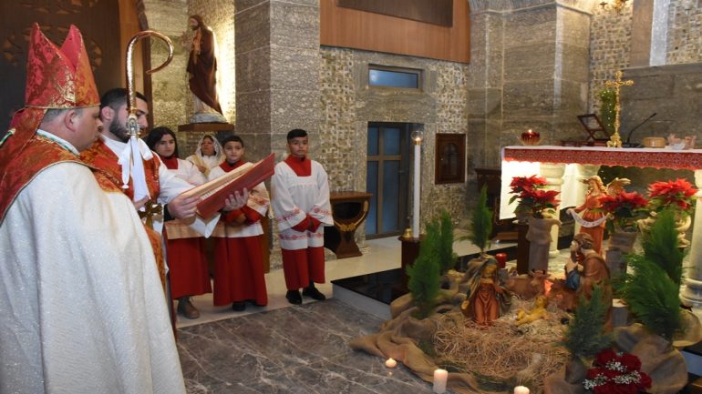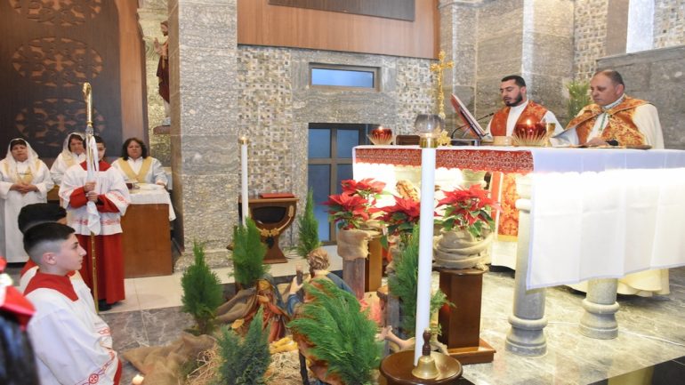 عشية ليلة الميلاد، السبت 24 كانون الاول 2022، وعند الساعة السابعة مساءً بدأت الصلاة الطقسية، تلاها القداس الإلهي الذي تراسه سيادة المطران مار بولس ثابت راعي ابرشية القوش الكلدانية يعاونه الاب رودي الصفار وبمشاركة الشمامسة وجوق الكنيسة، ليدخل الناس الى العالم الالهي ليرفعهم نحو الاعالي في اجواء الكنيسة السماوية فيشاركوا في هذا الوقت بالتسبيح للطفل المولود مع امه مريم.
