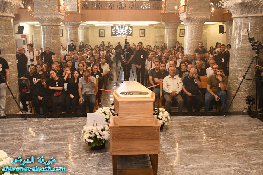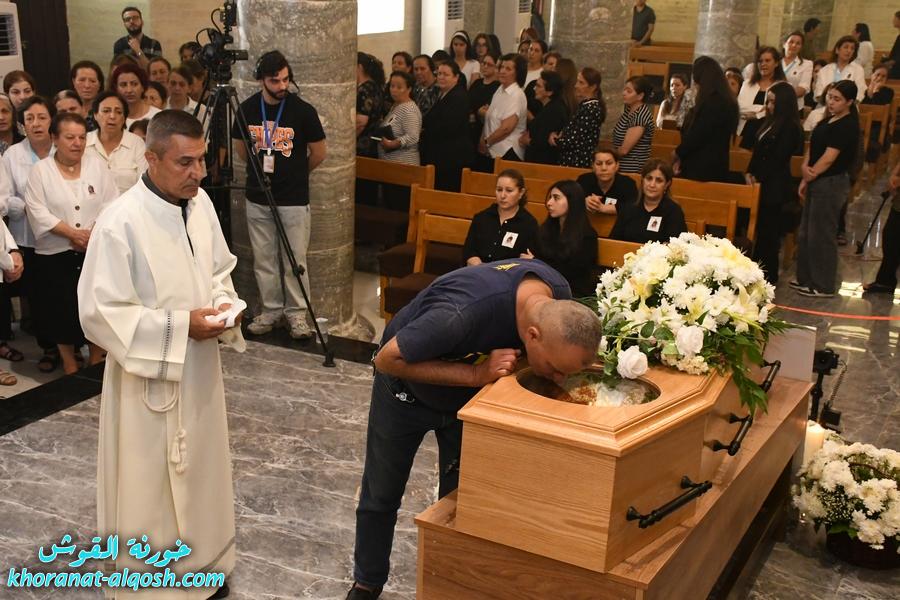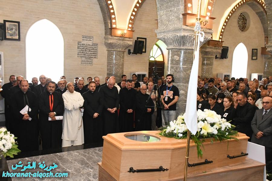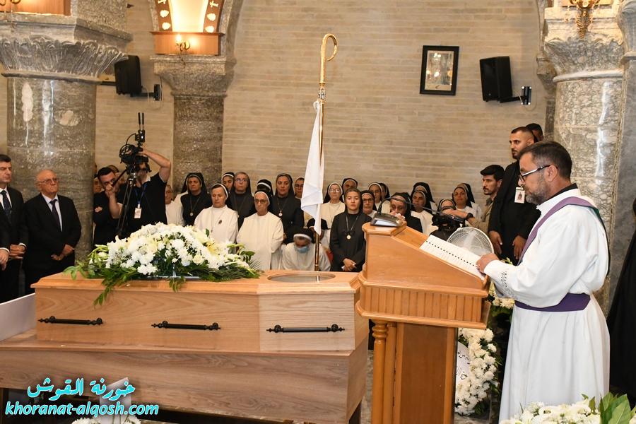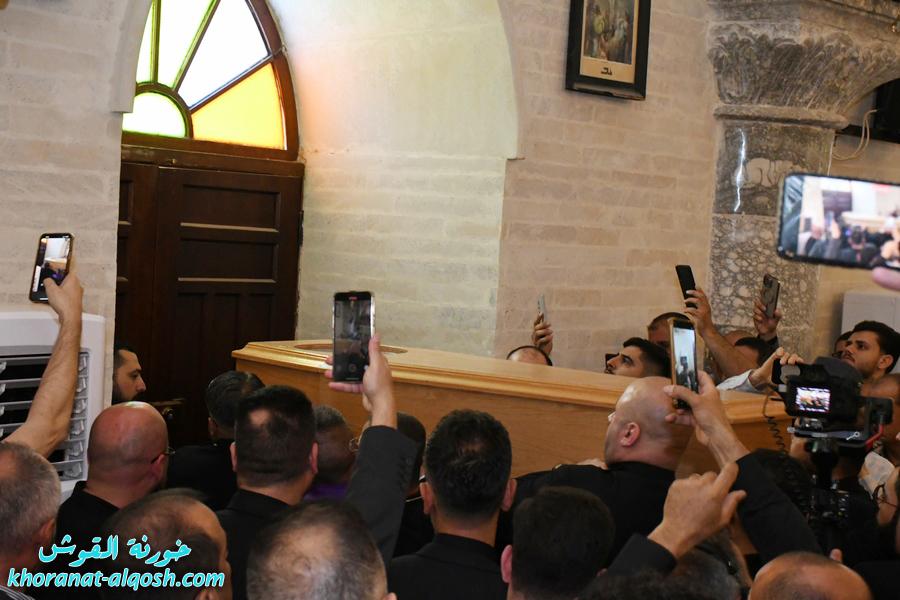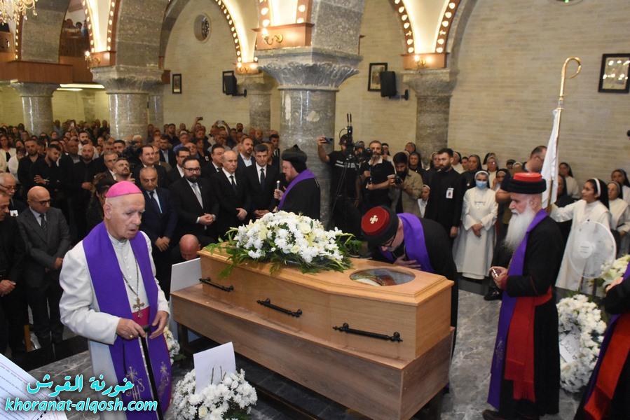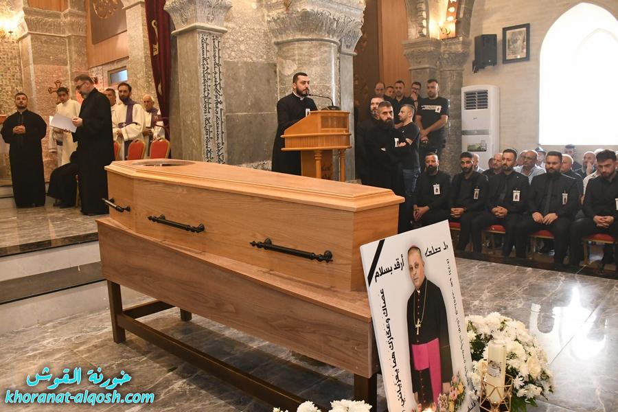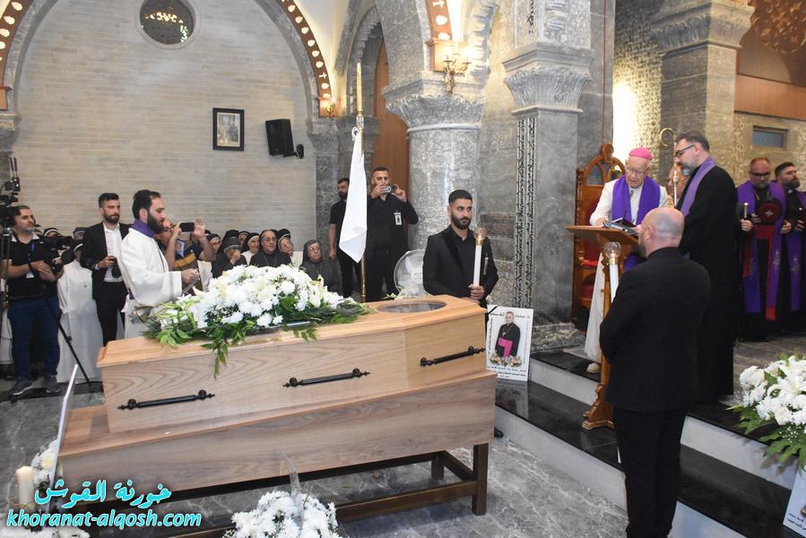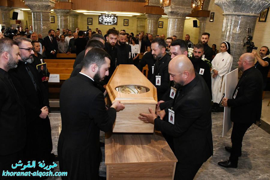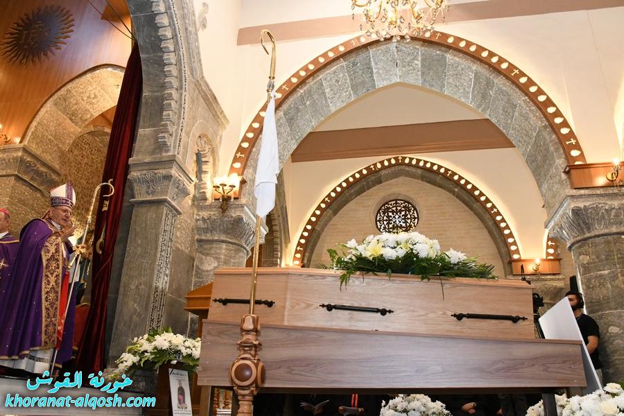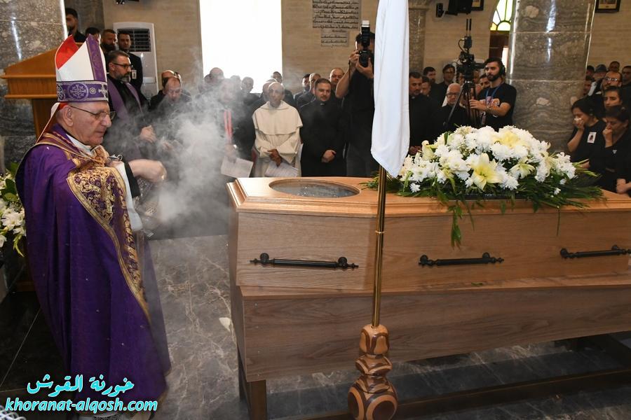 وسط التراتيل والصلوات، حمل الكهنة والمؤمنون الجثمان على الأكتاف في مشهد روحاني مؤثر، استعدادًا لرتبة صلاة الجنازة، التي أُقيمت داخل الكنيسة لألقاء النظرة الاخيرة، ثم ترأس غبطة البطريرك الكاردينال لويس روفائيل ساكو القداس الإلهي وصلاة الجناز، بمشاركة عدد من أصحاب السيادة المطارنة من الكنيسة الكلدانية، وكنائس المشرق الشقيقة، إلى جانب كوكبة من الآباء الكهنة، ومسؤولين سياسيين وحكوميين، ورؤساء أحزاب، وجمهور غفير من أبناء الشعب.