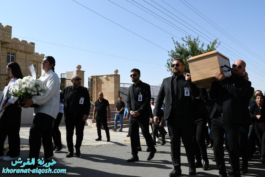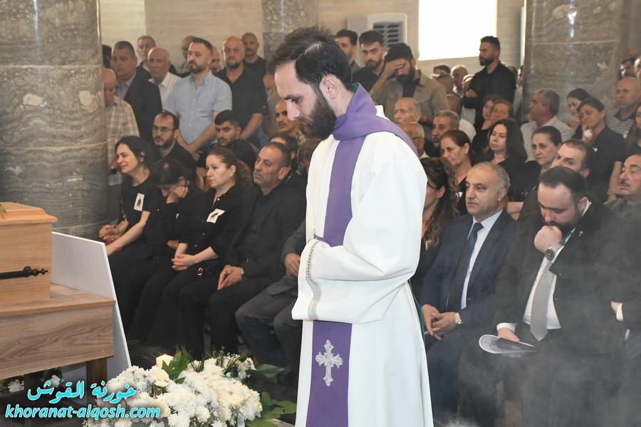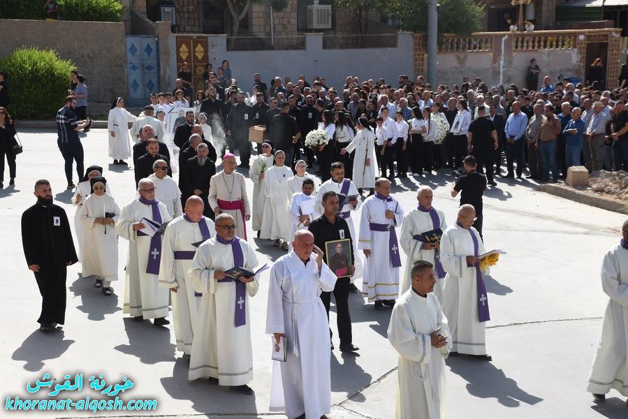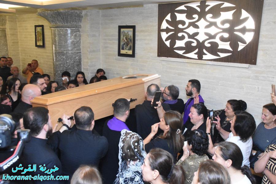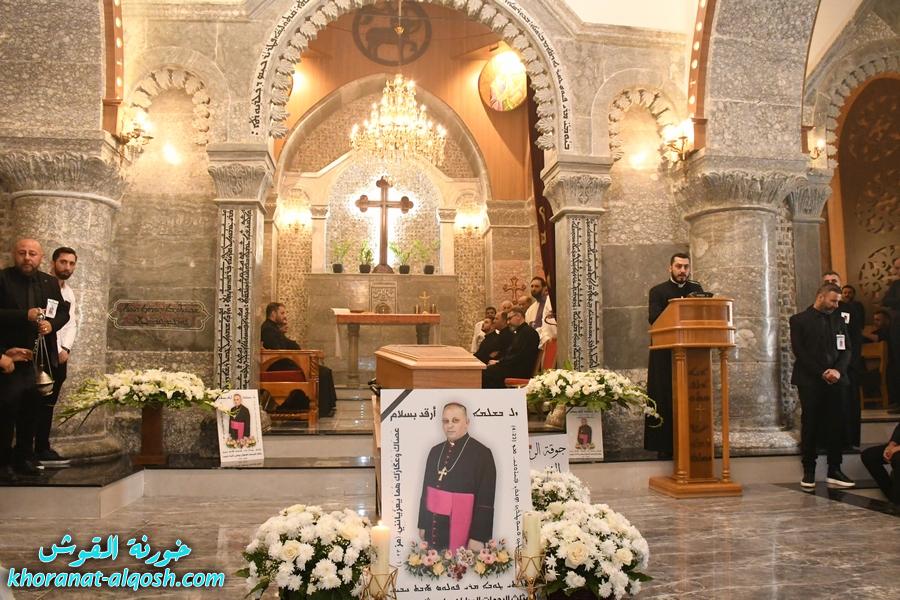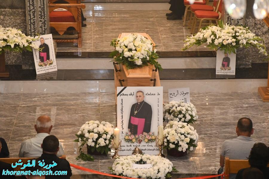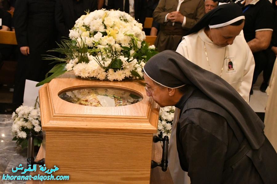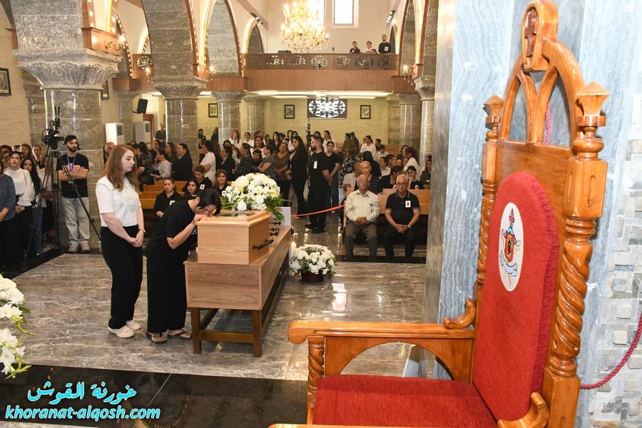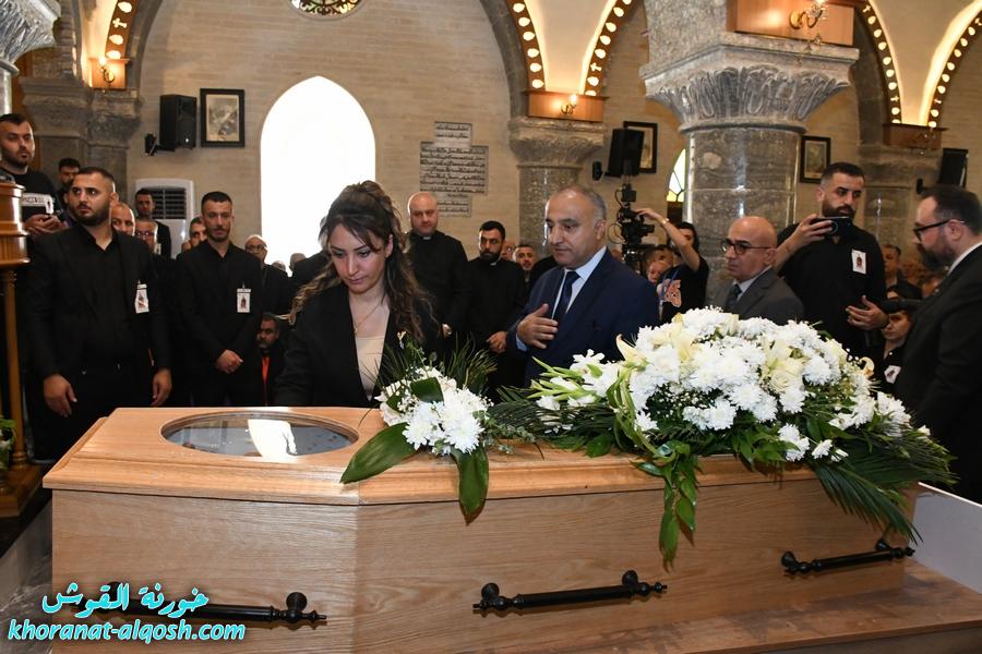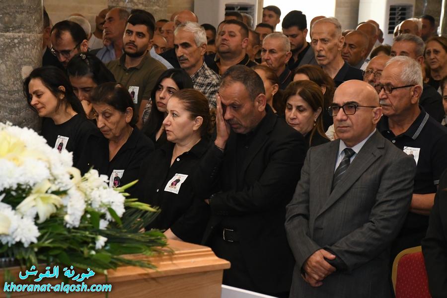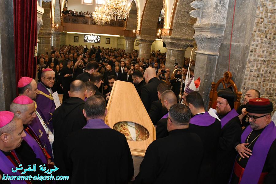 وسط التراتيل والصلوات، حمل الكهنة والمؤمنون الجثمان على الأكتاف في مشهد روحاني مؤثر، استعدادًا لرتبة صلاة الجنازة، التي أُقيمت داخل الكنيسة لألقاء النظرة الاخيرة، ثم ترأس غبطة البطريرك الكاردينال لويس روفائيل ساكو القداس الإلهي وصلاة الجناز، بمشاركة عدد من أصحاب السيادة المطارنة من الكنيسة الكلدانية، وكنائس المشرق الشقيقة، إلى جانب كوكبة من الآباء الكهنة، ومسؤولين سياسيين وحكوميين، ورؤساء أحزاب، وجمهور غفير من أبناء الشعب.