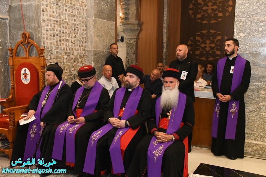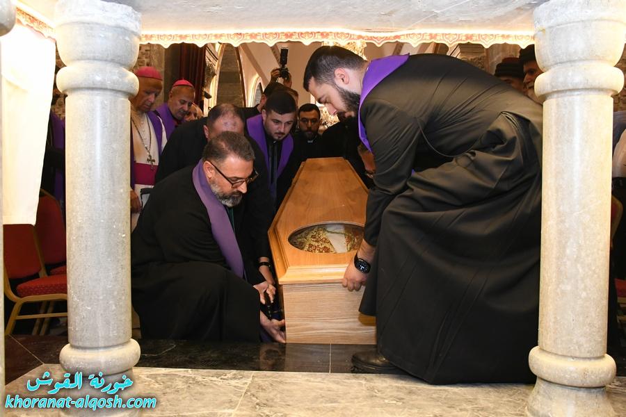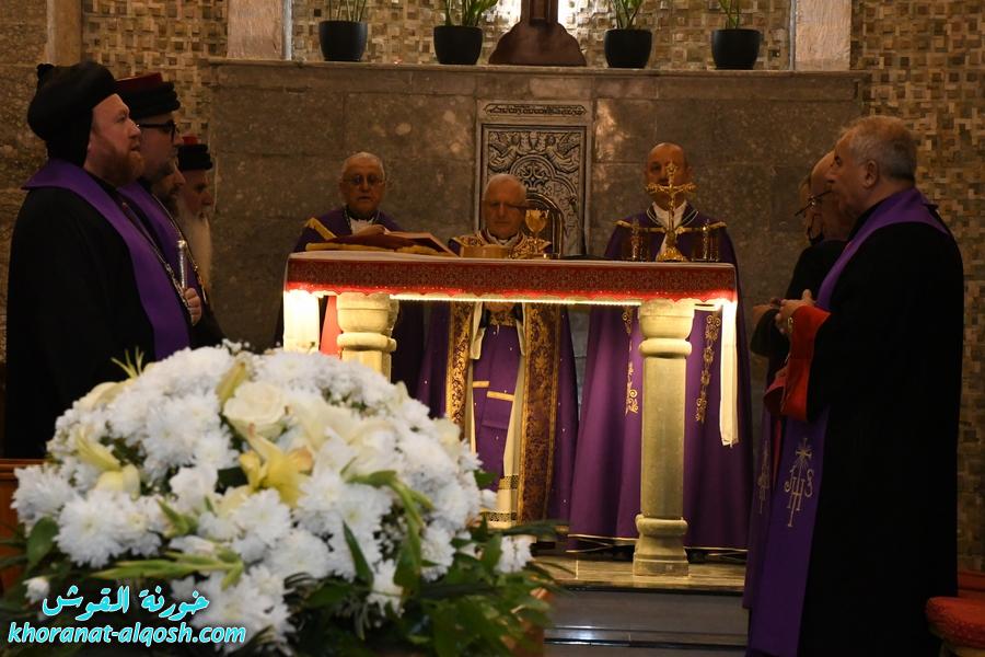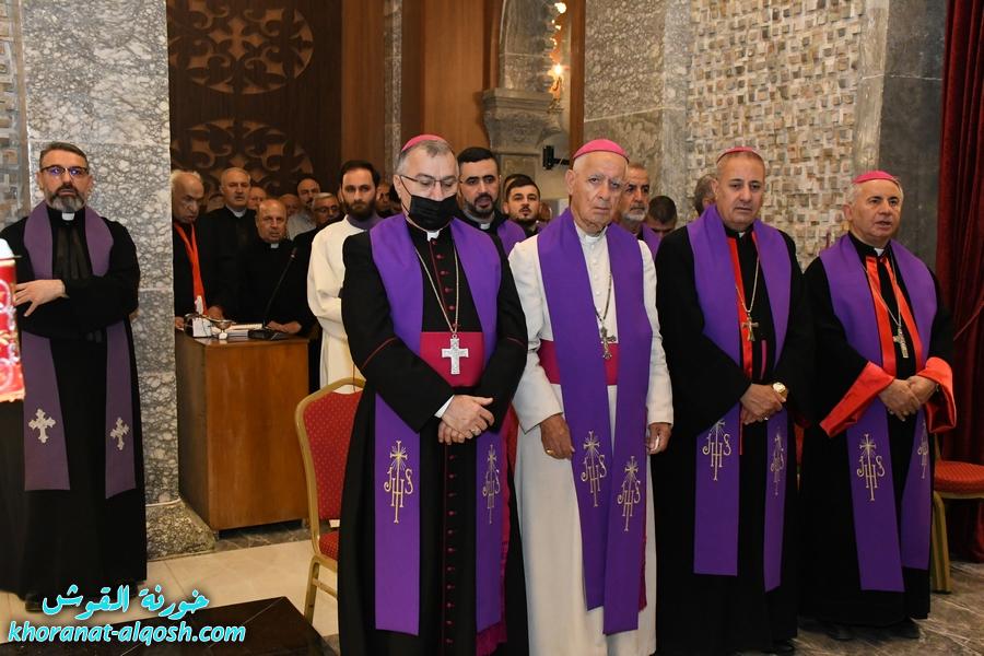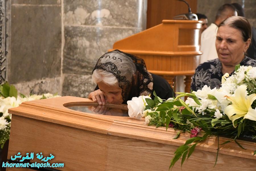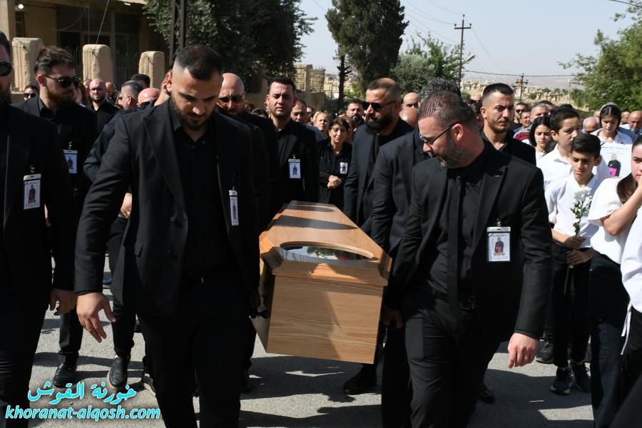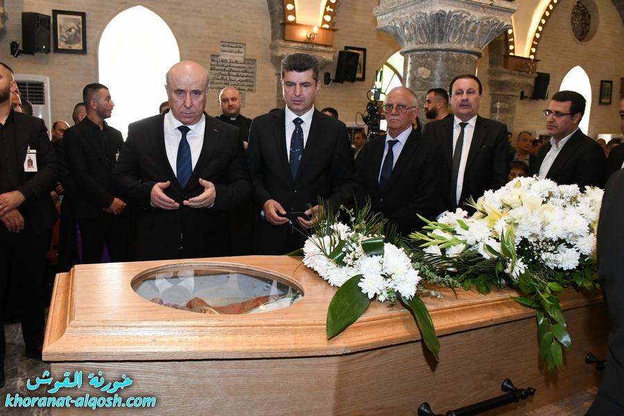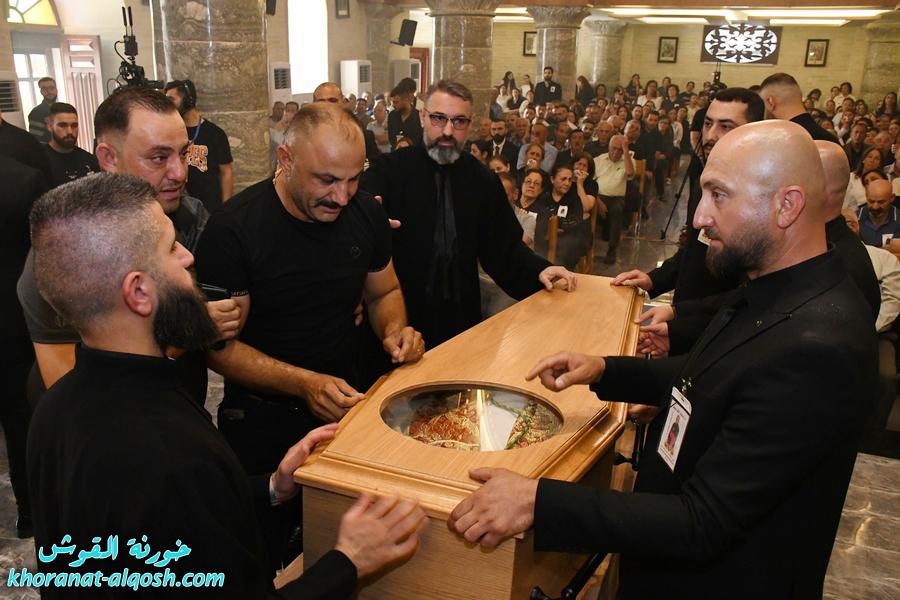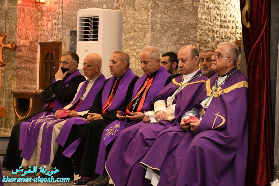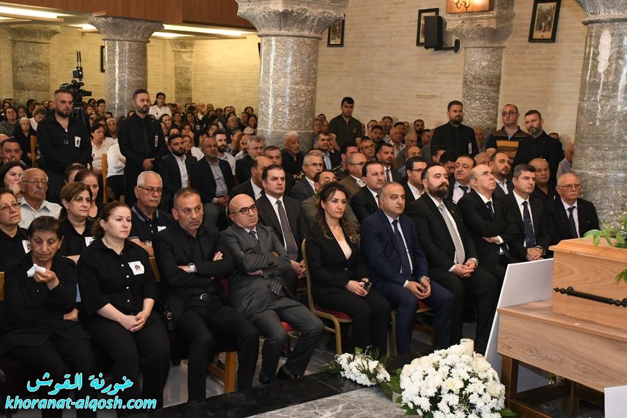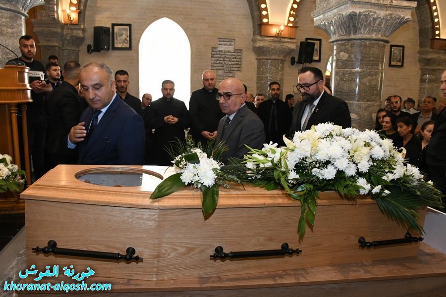 وسط التراتيل والصلوات، حمل الكهنة والمؤمنون الجثمان على الأكتاف في مشهد روحاني مؤثر، استعدادًا لرتبة صلاة الجنازة، التي أُقيمت داخل الكنيسة لألقاء النظرة الاخيرة، ثم ترأس غبطة البطريرك الكاردينال لويس روفائيل ساكو القداس الإلهي وصلاة الجناز، بمشاركة عدد من أصحاب السيادة المطارنة من الكنيسة الكلدانية، وكنائس المشرق الشقيقة، إلى جانب كوكبة من الآباء الكهنة، ومسؤولين سياسيين وحكوميين، ورؤساء أحزاب، وجمهور غفير من أبناء الشعب.