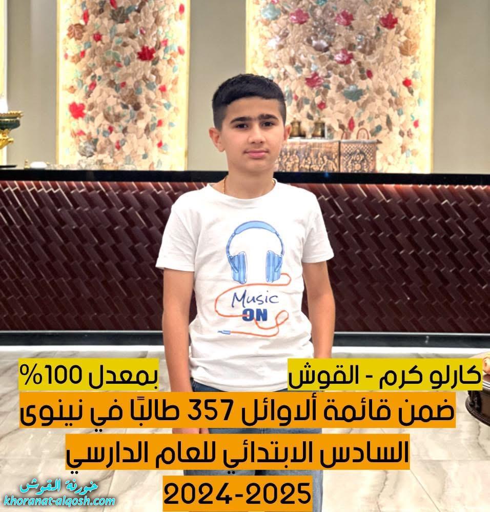 في عينيه بريق الامل وملامح وجهه تزهو بالذكاء وفي اعماقه يتوقد حلم واحد هو التفوق الذي هو حصيلة سهر ومثابرة دؤوبة لا يناله الا من يبذل جهدا ويؤرق ليلا ويسعى مجتهدا ومن اجل تحقيق الطالب والطالبة هدفهما المنشود يعيشان اياما محفوفة بالصعاب و معبدة بالقلق لكن بالاصرار والتشبث بالاجتهاد يتحقق لهما ما يهدفان اليه من التفوق هكذا قطف الطالب المتفوق كارلو كرم ثمرة سهره الدائم واجتهاده المتواصل خلال العام الدراسي ( 2024 – 2025 ) فبات فخرا لعائلته ومدرسته وبلدته القوش حيث حصل على معدل 100% ارتقى الى مستوى عالي حينما حصل على هذا المعدل .. كارلو احد طلاب مدرسة ابتدائية القوش الاولى للبنين كان الاول على مدارس القوش وتلكيف وضمن قائمة 357 من الطلبة الاوائل في مدارس محافظة نينوى وبهذه المناسبة السعيدة ارتئينا ان نلتقي به ونجري معه هذا اللقاء فتشرفنا بحضوره ولقاءه على حدائق نادي القوش العائلي وبصحبته والده الاعلامي المعروف كرم القوشي وكالمعتاد بدأ اللقاء بكلمة ترحيبية بالضيف العزيز شاكرا اياه على النتيجة الرائعة التي حصل عليها في الامتحان الوزاري الاخير للصف السادس الابتدائي والتي ادخل بها البهجة والفرحة الى قلوب عائلته ومدرسته وبلدته القوش بشكل عام وخلال اللقاء سألنا الضيف عن بطاقته الشخصية وتميزه في الامتحان فاجاب : انا الطالب كارلو كرم كوريال جيقا من مواليد القوش 2013 انهيت دراستي الابتدائية في مدرسة القوش الاولى للبنين وحصلت على معدل 100% حيث كانت مرتبتي الاول على مدارس القوش وعلى كافة مدارس قضاء تلكيف والبالغ عدد التلاميذ فيها (360 تلميذا ) وعلى مستوى محافظة نينوى كان ضمن الطلبة الاوائل للصف السادس الابتدائي والبالغ عددهم 357 طالبا.