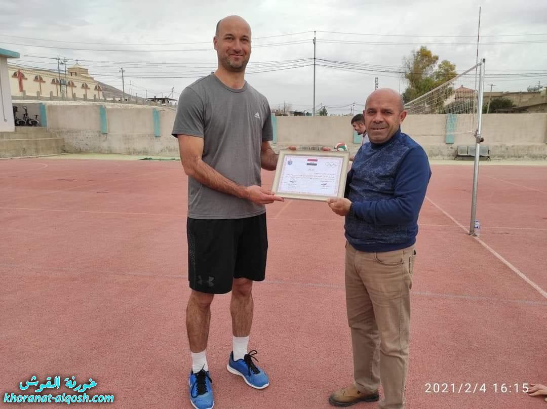 حيث منحت الهيئة الادارية لنادي القوش الرياضي شهادة شكر وتقدير للكابتن ثائر يوبيل المدرب المخضرم للفرق الرياضية بكرة القدم في النادي وذلك لتفانيه في اداء واجباته التدريبية بكل اخلاص منذ تأسيس النادي وحرصه اللامحدود من اجل الارتقاء بالفرق الرياضية للنادي الى المستوى الطموح خلال مسيرته الرياضية، و لمدرب فرق كرة الطائرة الكابتن وميض بنيامين ميخا تثميناً وتقديراً لجهوده المتواصلة في الاشراف وتدريب فرق كرة الطائرة لكلا الجنسين في النادي.