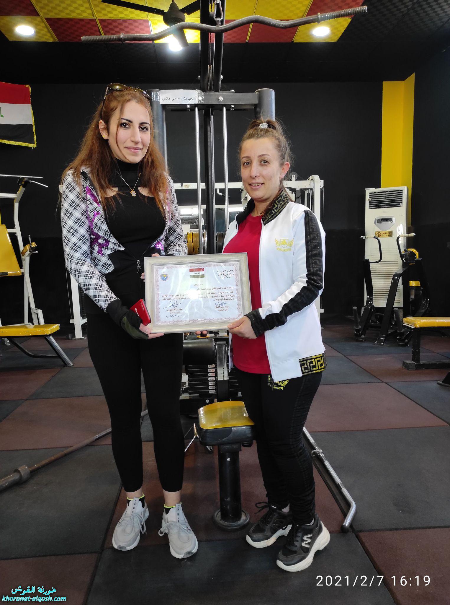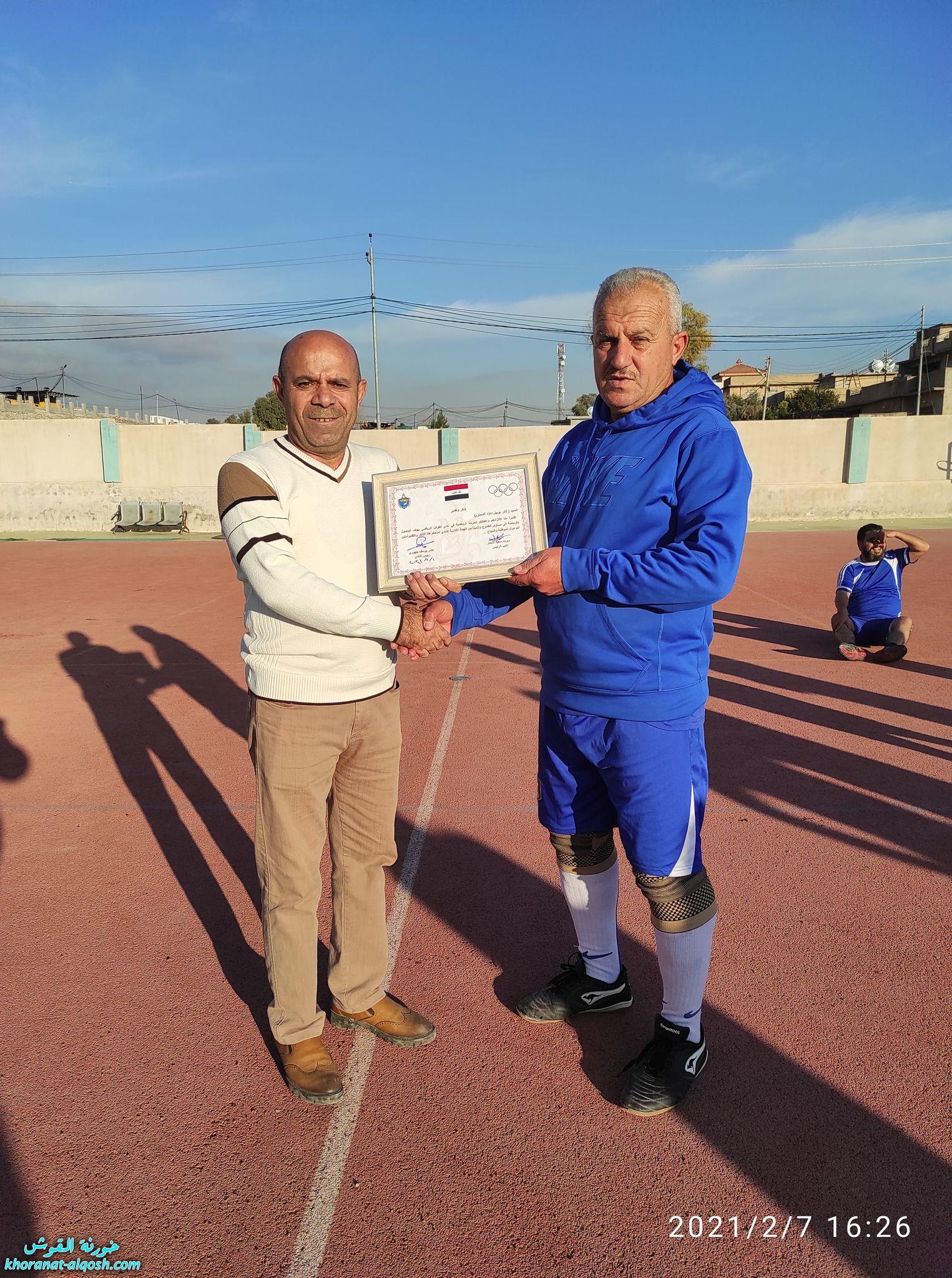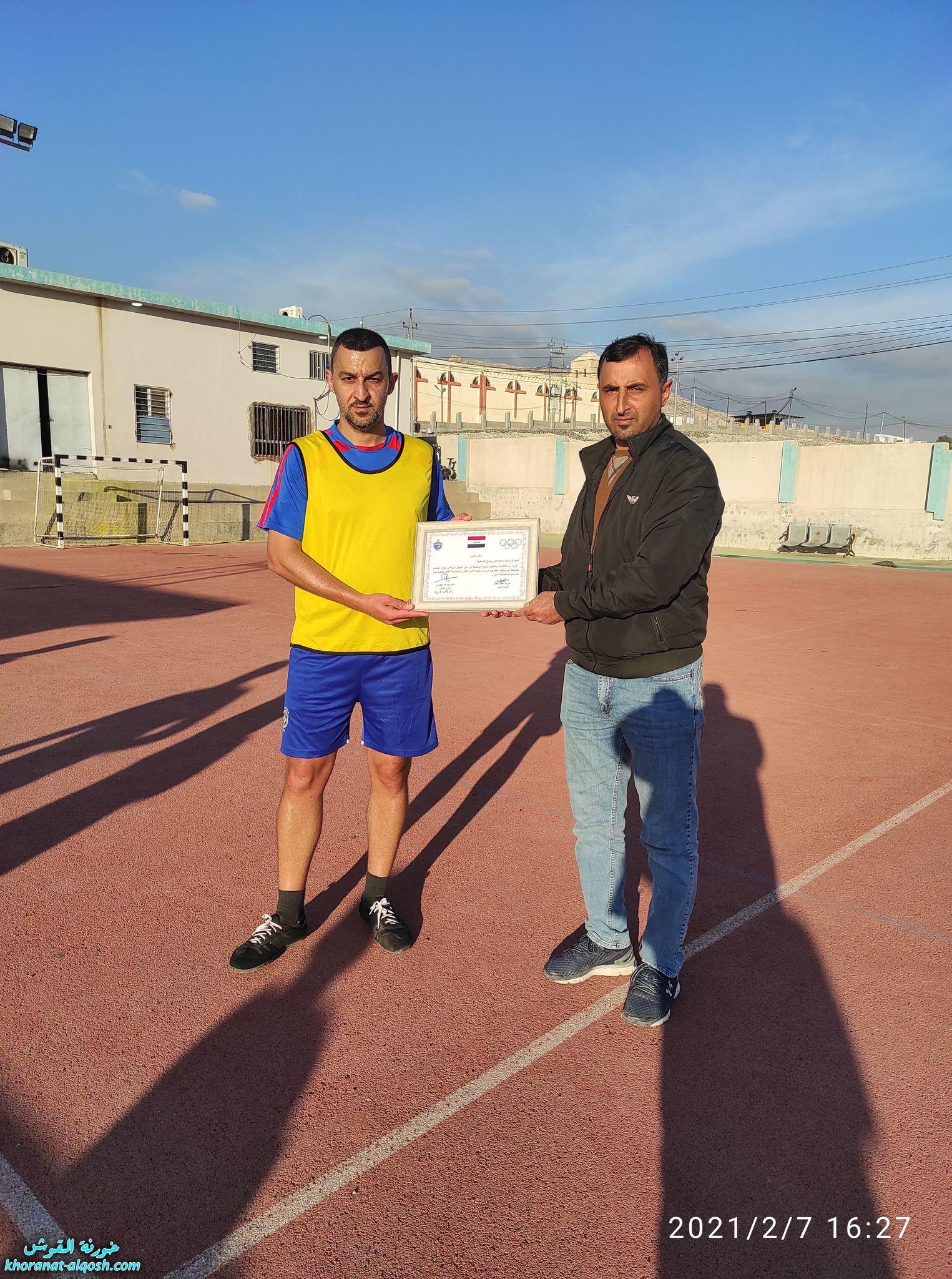 كما ومُنح لاعب كرة القدم راندي صلاح القس يونان بشهادة شكر وتقدير من قبل الهيئة الادارية لنادي القوش الرياضي وذلك لما يتميز به من صفات اللاعب الخلوق والملتزم في حضور الوحدات التدريبية وبشكل متواصل، كما ومنحت الهيئة شهادة شكر وتقدير للسيدة عذراء نصير القس يونان لجهودها المتميزة وكفائتها في الاشراف وتدريب العنصر النسوي في قاعة الرشاقة لنادي القوش الرياضي وتفانيها في واجبها التدريبي.