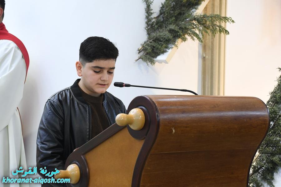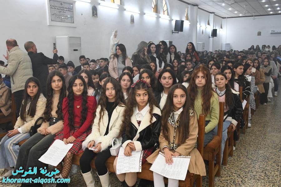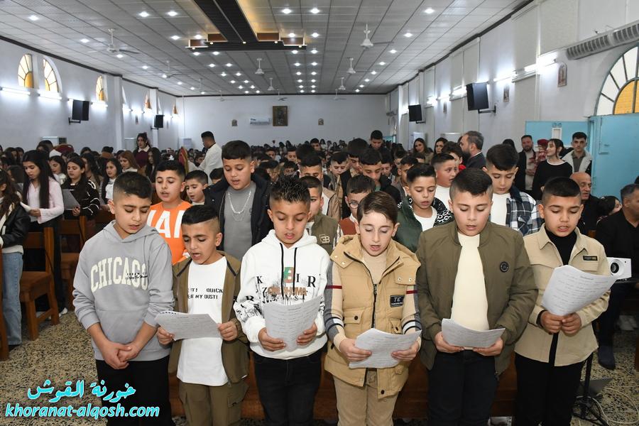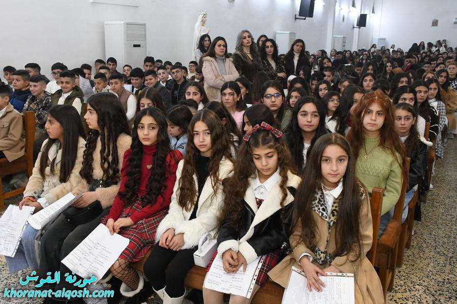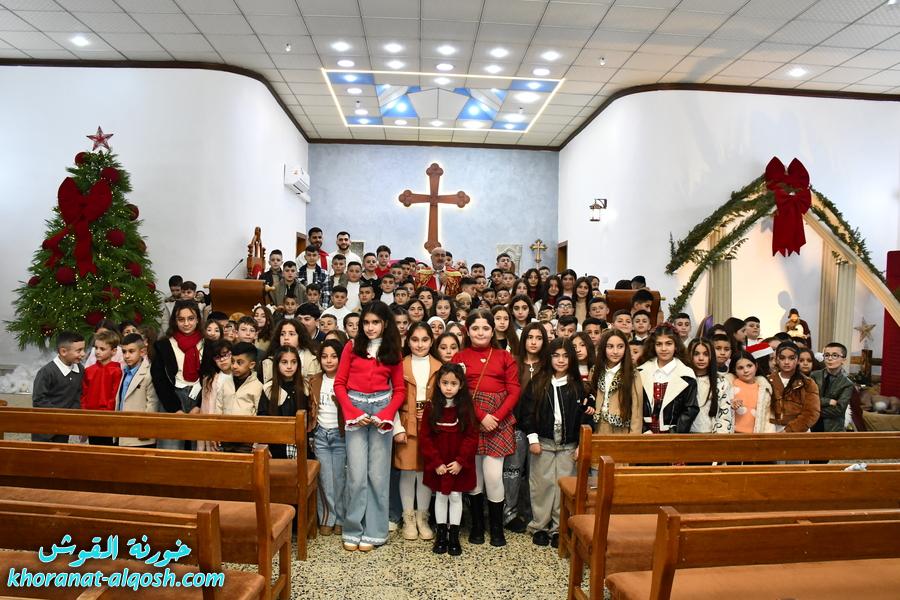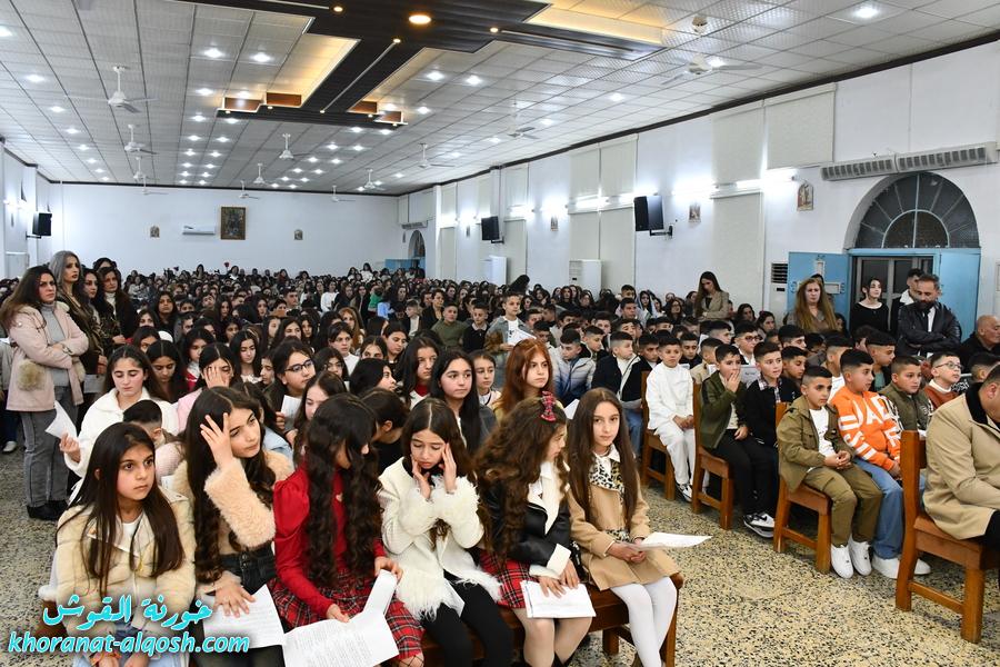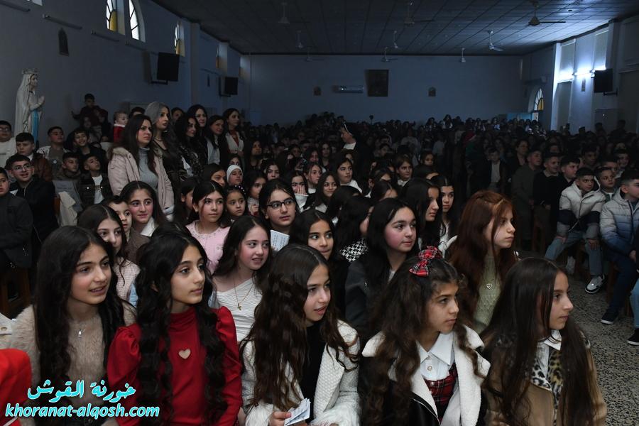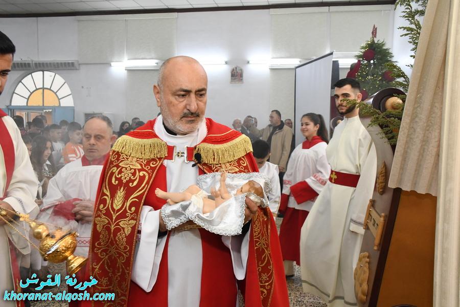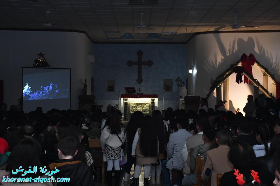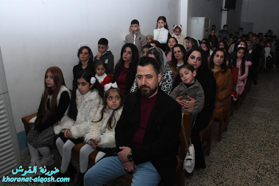 ترأس القداس الخوراسقف الاب د. غزوان يوسف شهارا، و بمشاركة الطلاب في الخدمة الكاملة للقداس إلى جانب الترانيم التي تميزت بأصوات الأطفال، ما أضفى على المكان جوًا من الفرح الطفولي وعُرض مشهد الميلادي الذي تم تصويره مسبقاً في بلدة القوش بمشاركة تلاميذة المدارس الابتدائية.