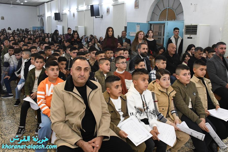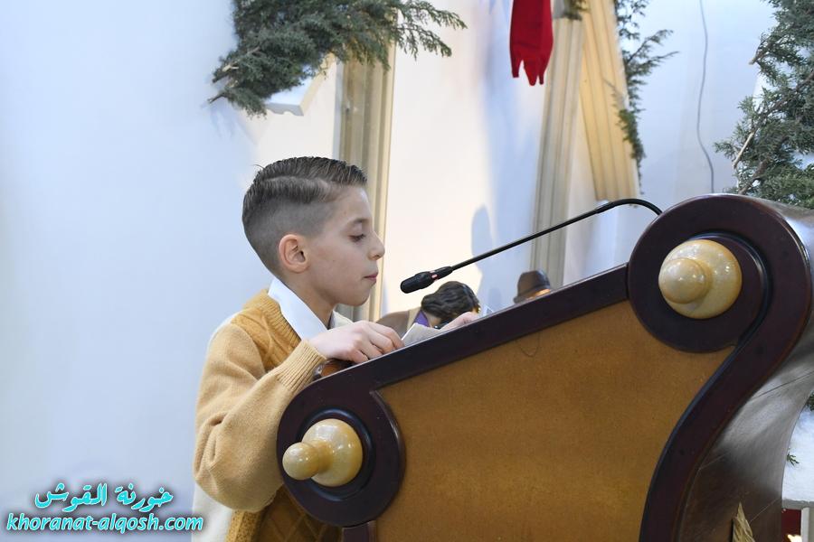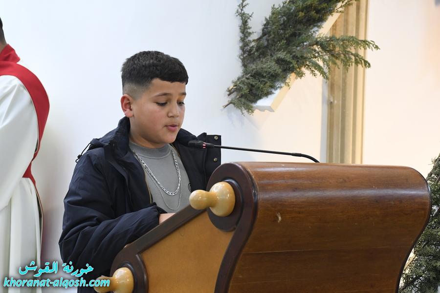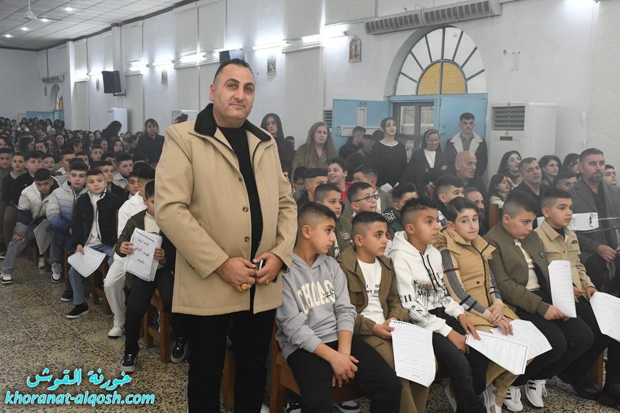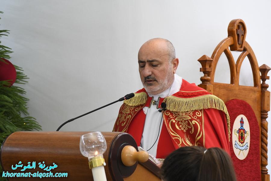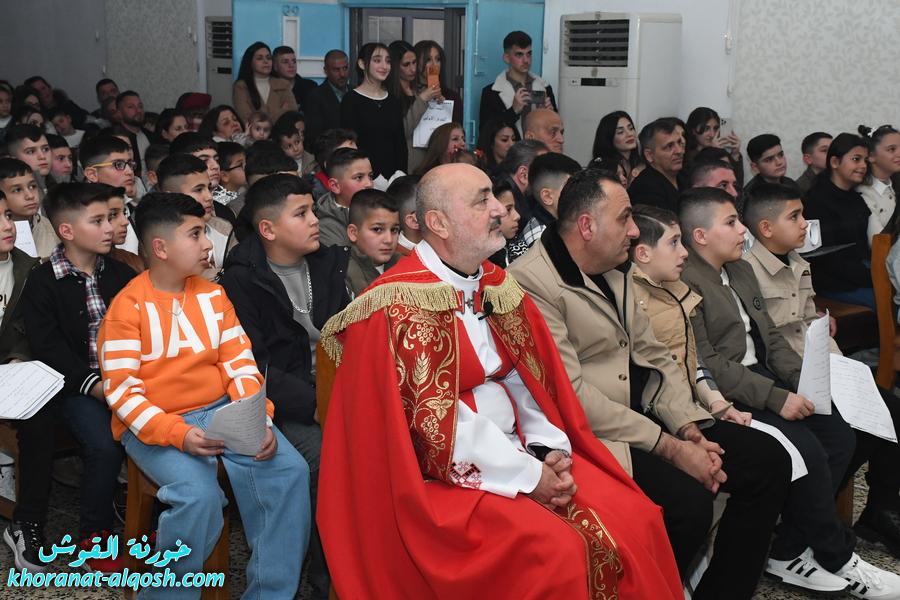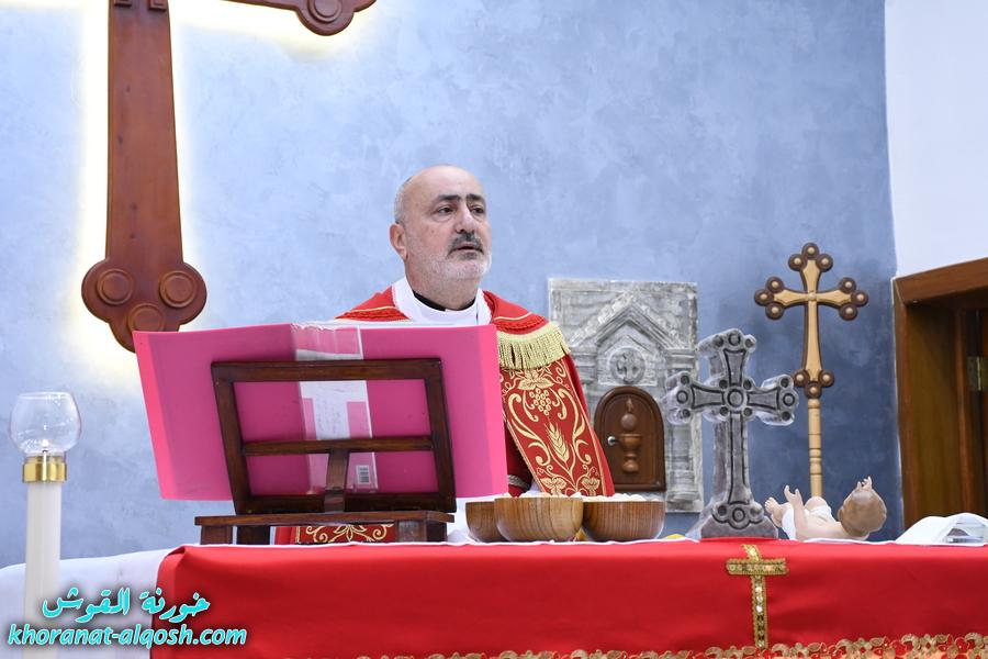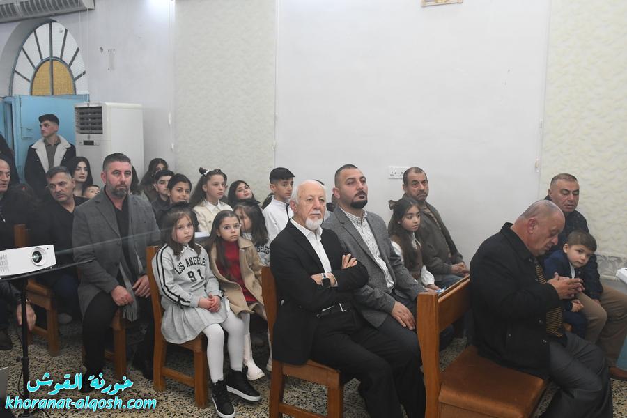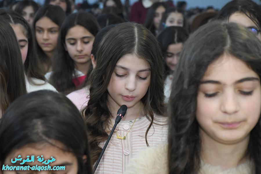 ترأس القداس الخوراسقف الاب د. غزوان يوسف شهارا، و بمشاركة الطلاب في الخدمة الكاملة للقداس إلى جانب الترانيم التي تميزت بأصوات الأطفال، ما أضفى على المكان جوًا من الفرح الطفولي وعُرض مشهد الميلادي الذي تم تصويره مسبقاً في بلدة القوش بمشاركة تلاميذة المدارس الابتدائية.
