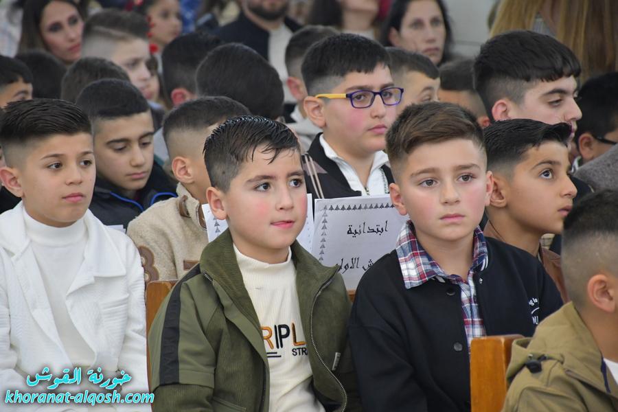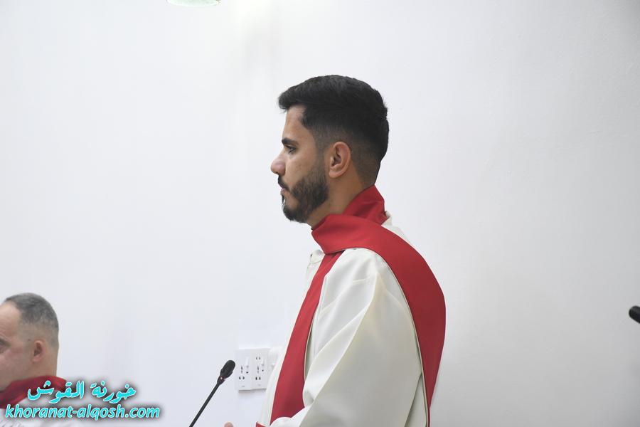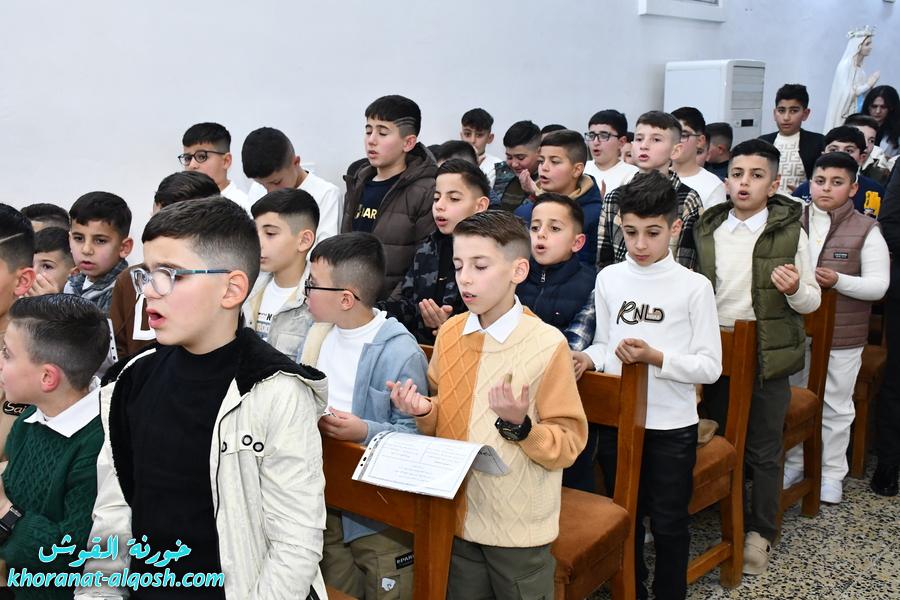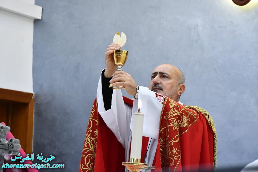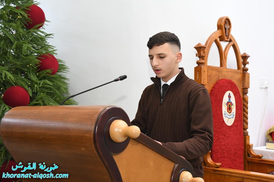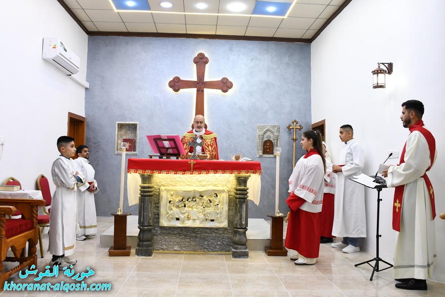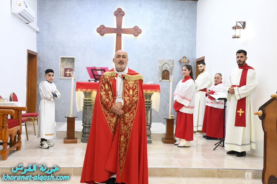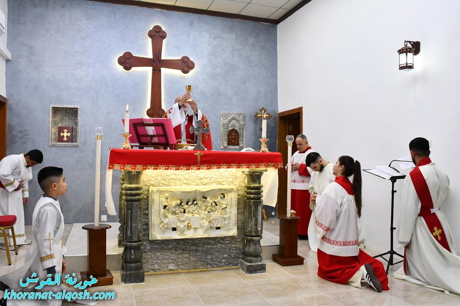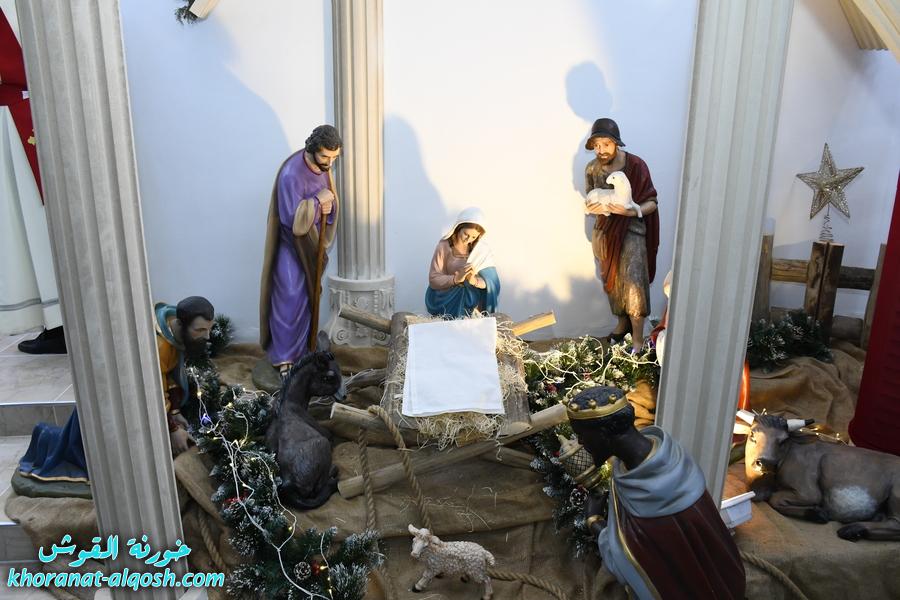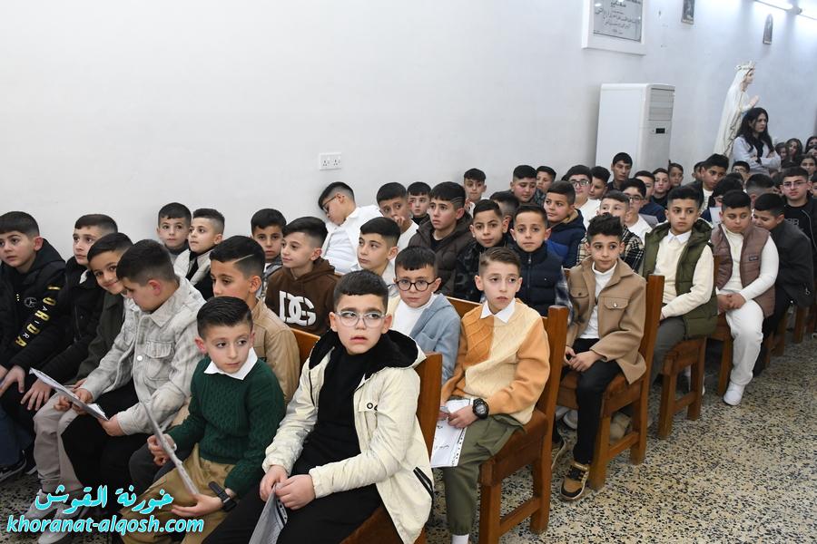 ترأس القداس الخوراسقف الاب د. غزوان يوسف شهارا، و بمشاركة الطلاب في الخدمة الكاملة للقداس إلى جانب الترانيم التي تميزت بأصوات الأطفال، ما أضفى على المكان جوًا من الفرح الطفولي وعُرض مشهد الميلادي الذي تم تصويره مسبقاً في بلدة القوش بمشاركة تلاميذة المدارس الابتدائية.